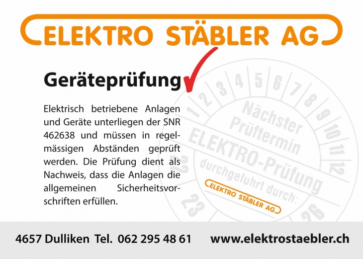 Bei Elektro Stäbler AG prüfen wir Ihre Elektrowerkzeuge, Kabelrollen, Verlängerungskabel, Bohrmaschinen und viele andere elektrische Geräte fachgerecht, effizient und nach der gültigen Norm SNR 462638.